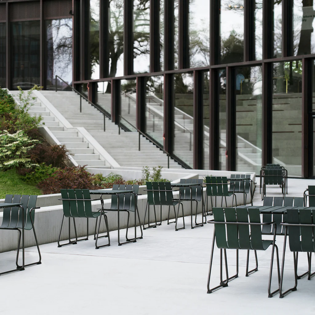 Slats made of pharma plastic waste mixed with recycled hard plastic. Steel tube, partly recycled steel, Gun metal finish